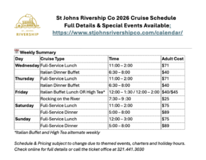 The St. Johns Rivership Co. offers more than the best river cruises. We provide a different way to experience Florida. To appreciate its wildlife, its beauty and its warmth. All while indulging in chef-prepared cuisine, live onboard entertainment, and endless hospitality in climate-controlled comfort.