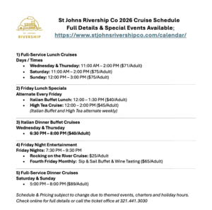 Additional special events booked throughout the year!ย We begin boarding 30 minutes before departure.ย Our cruises include different forms of entertainment and food options.ย Please review our menus and the full cruise listing for a description of the food and entertainment.